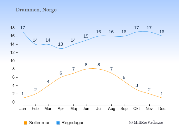 På denna sida kan du få en överblick över de statistiska klimatuppgifterna för Drammen månad för månad jämfört med klimatet i Stockholm. Information om det historiska klimatet kan du använda för att planera din semester och hitta den bästa tiden att resa till Drammen på.