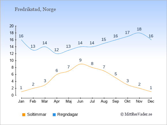Graferna visar det genomsnittliga antalet soltimmar i Fredrikstad per dag