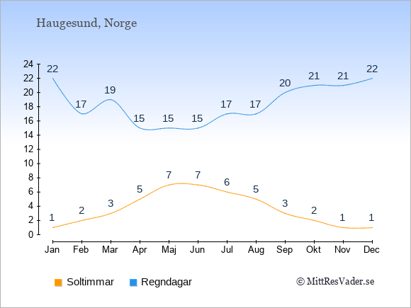 Graferna visar det genomsnittliga antalet soltimmar i Haugesund per dag