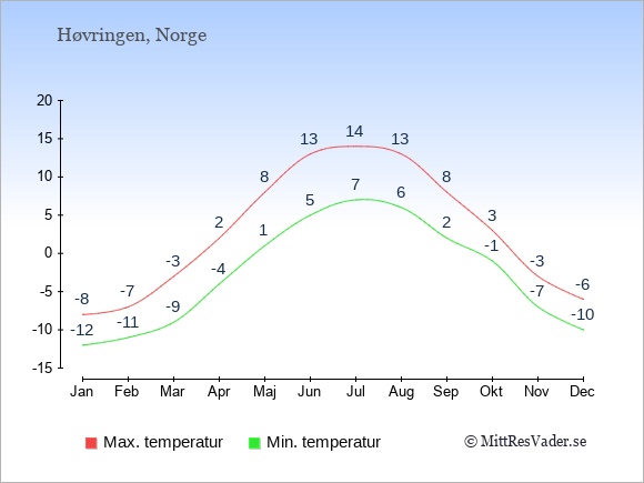 Informationen om Høvringens väder kommer från dalen. Typiskt sjunker temperaturen med cirka en grad för varje 200 meter ju högre upp du kommer i backen. Högre upp i skidområdet kan därför vara betydligt kallare än diagrammet visar.