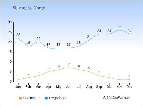 Graferna visar det genomsnittliga antalet soltimmar i Stavanger per dag