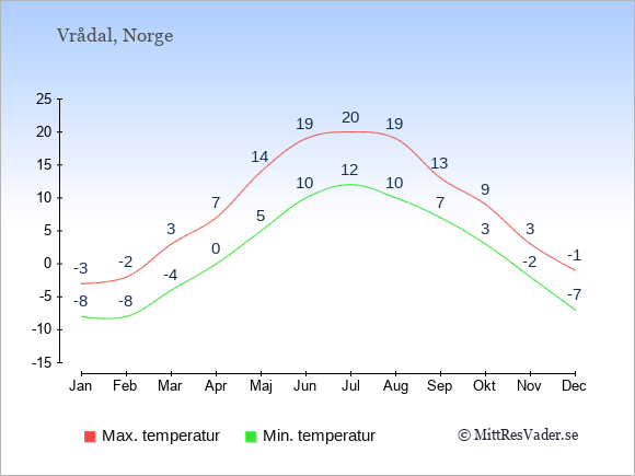 Informationen om Vrådals väder kommer från dalen. Typiskt sjunker temperaturen med cirka en grad för varje 200 meter ju högre upp du kommer i backen. Högre upp i skidområdet kan därför vara betydligt kallare än diagrammet visar.