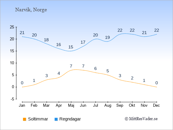 Grafen visar det genomsnittliga antalet soltimmar i Narvik under en viss månad (soltimmar är det antalet timmar per dag där solen skinnar), och antalet regndagar (dvs. det genomsnittliga antalet dagar