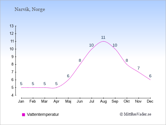 För att se hur vädret i Narvik skiljer sig från vädret hemma, kan du också jämföra siffrorna måned för måned med motsvarande siffror för Sverige under samma period här: Narviks klimat.
