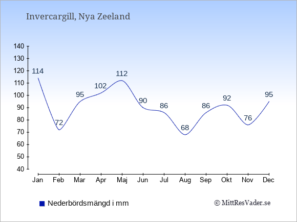 För att se hur vädret i Invercargill skiljer sig från vädret hemma, kan du också jämföra siffrorna måned för måned med motsvarande siffror för Sverige under samma period här: Invercargills klimat.