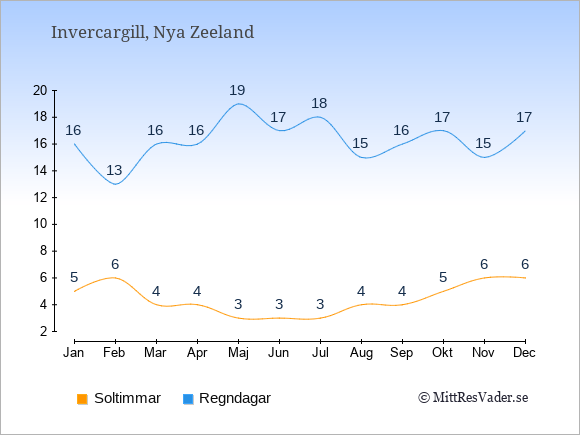 Väder i Invercargill: Soltimmar och regndagar