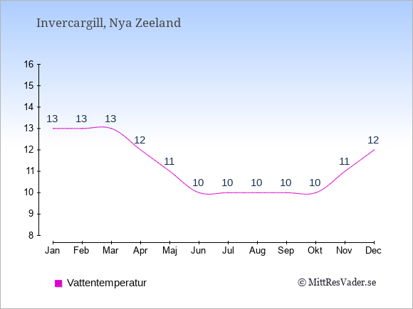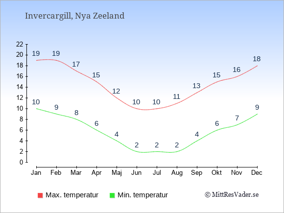 Grafen visar de genomsnittligt högsta temperaturerna i Invercargill (vanligtvis det värde som uppmätts mitt på dagen) och de genomsnittligt lägsta temperaturer (vanligtvis tidpunkten just innan soluppgång).