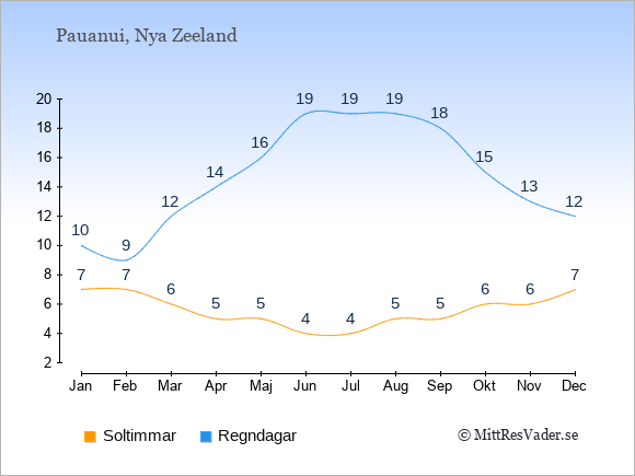 Grafen visar det genomsnittliga antalet soltimmar i Pauanui under en viss månad (soltimmar är det antalet timmar per dag där solen skinnar), och antalet regndagar (dvs. det genomsnittliga antalet dagar
