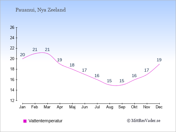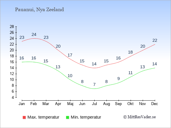 Grafen visar de genomsnittligt högsta temperaturerna i Pauanui (vanligtvis det värde som uppmätts mitt på dagen) och de genomsnittligt lägsta temperaturer (vanligtvis tidpunkten just innan soluppgång).