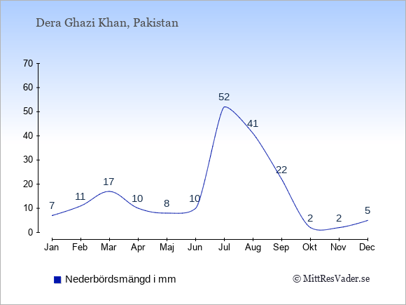För att se hur vädret i Dera Ghazi Khan skiljer sig från vädret hemma, kan du också jämföra siffrorna måned för måned med motsvarande siffror för Sverige under samma period här: Dera Ghazi Khans klimat.