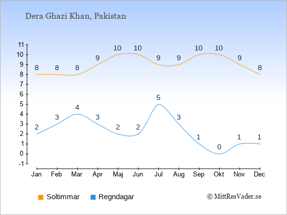 Väder i Dera Ghazi Khan: Soltimmar och regndagar