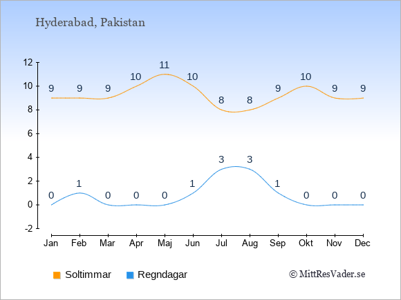 Grafen visar det genomsnittliga antalet soltimmar i Hyderabad under en viss månad (soltimmar är det antalet timmar per dag där solen skinnar), och antalet regndagar (dvs. det genomsnittliga antalet dagar