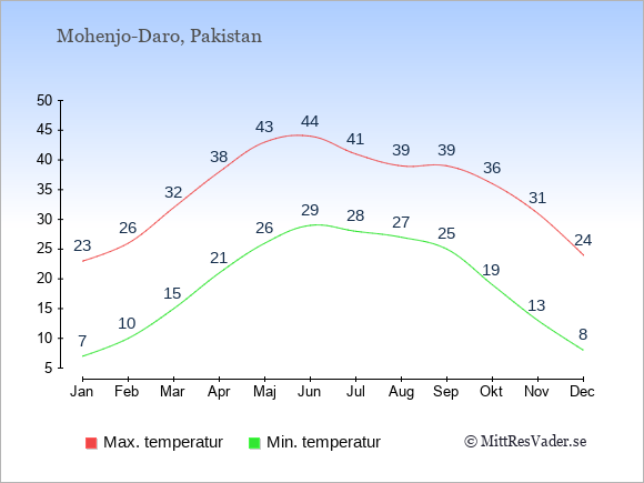 Grafen visar de genomsnittligt högsta temperaturerna i Mohenjo-Daro (vanligtvis det värde som uppmätts mitt på dagen) och de genomsnittligt lägsta temperaturer (vanligtvis tidpunkten just innan soluppgång).