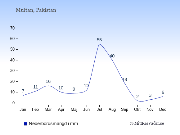 För att se hur vädret i Multan skiljer sig från vädret hemma, kan du också jämföra siffrorna måned för måned med motsvarande siffror för Sverige under samma period här: Multans klimat.