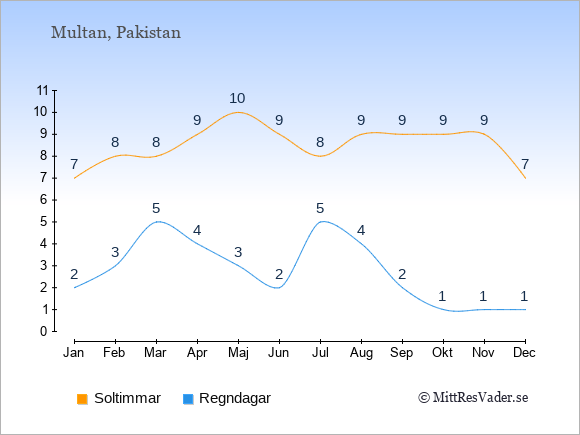 Grafen visar det genomsnittliga antalet soltimmar i Multan under en viss månad (soltimmar är det antalet timmar per dag där solen skinnar), och antalet regndagar (dvs. det genomsnittliga antalet dagar