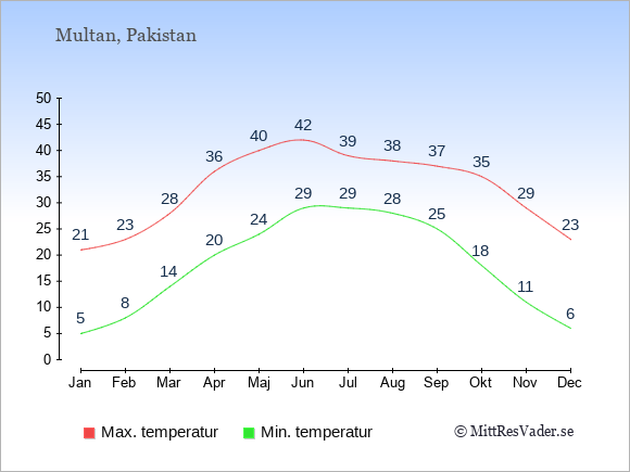 Grafen visar de genomsnittligt högsta temperaturerna i Multan (vanligtvis det värde som uppmätts mitt på dagen) och de genomsnittligt lägsta temperaturer (vanligtvis tidpunkten just innan soluppgång).