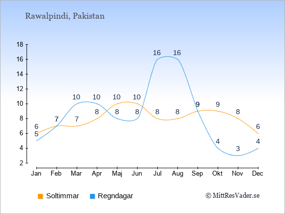 Grafen visar det genomsnittliga antalet soltimmar i Rawalpindi under en viss månad (soltimmar är det antalet timmar per dag där solen skinnar), och antalet regndagar (dvs. det genomsnittliga antalet dagar