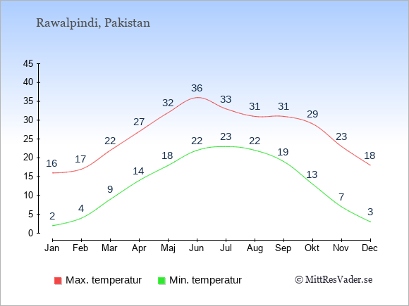 Grafen visar de genomsnittligt högsta temperaturerna i Rawalpindi (vanligtvis det värde som uppmätts mitt på dagen) och de genomsnittligt lägsta temperaturer (vanligtvis tidpunkten just innan soluppgång).