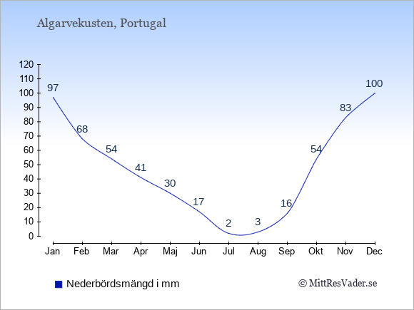 Vädret på Algarvekusten är oftast bäst i de månader där det finns många soltimmar och få dagars nederbörd.
