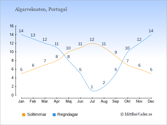 Grafen visar det genomsnittliga antalet soltimmar på Algarvekusten under en viss månad (soltimmar är det antalet timmar per dag där solen skinnar), och antalet regndagar (dvs. det genomsnittliga antalet dagar