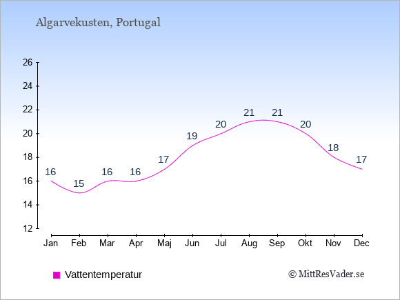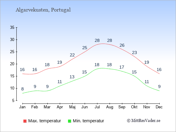 Grafen visar de genomsnittligt högsta temperaturerna på Algarvekusten (vanligtvis det värde som uppmätts mitt på dagen) och de genomsnittligt lägsta temperaturer (vanligtvis tidpunkten just innan soluppgång).