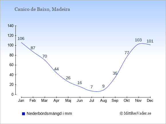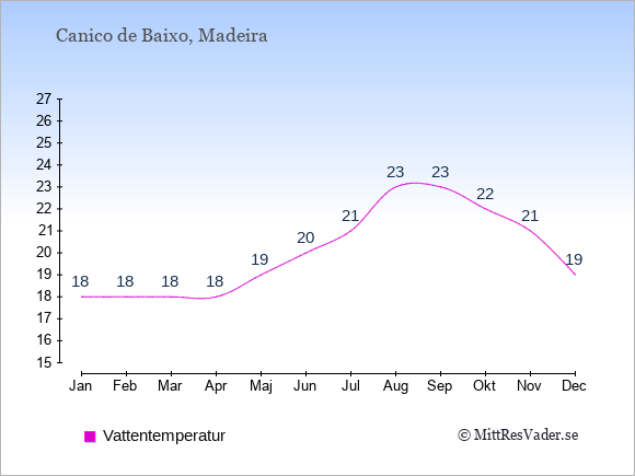 För att se hur vädret i Canico de Baixo skiljer sig från vädret hemma, kan du också jämföra siffrorna måned för måned med motsvarande siffror för Sverige under samma period här: Canico de Baixos klimat.