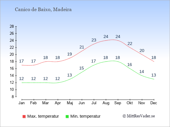 Grafen visar de genomsnittligt högsta temperaturerna i Canico de Baixo (vanligtvis det värde som uppmätts mitt på dagen) och de genomsnittligt lägsta temperaturer (vanligtvis tidpunkten just innan soluppgång).