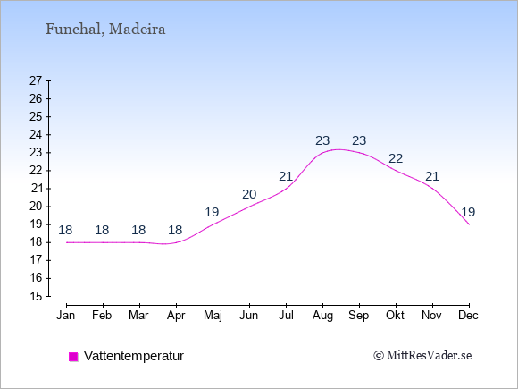 För att se hur vädret i Funchal skiljer sig från vädret hemma, kan du också jämföra siffrorna måned för måned med motsvarande siffror för Sverige under samma period här: Funchals klimat.
