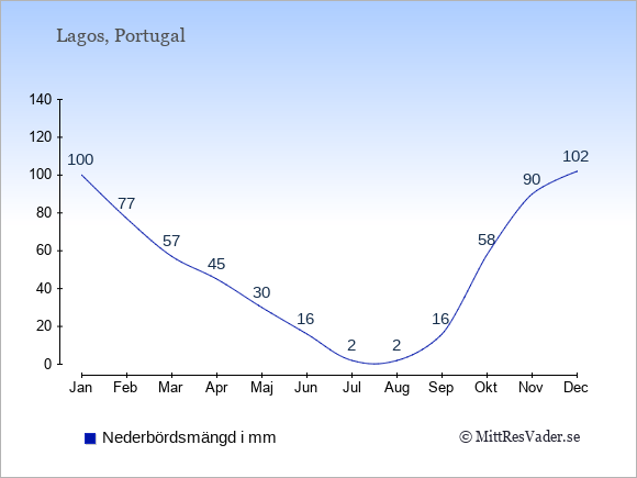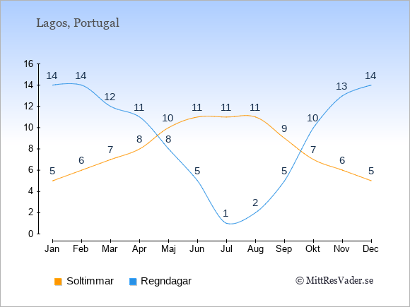 Vädret i Lagos är oftast bäst i de månader där det finns många soltimmar och få dagars nederbörd.