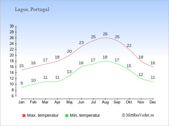 Grafen visar de genomsnittligt högsta temperaturerna i Lagos (vanligtvis det värde som uppmätts mitt på dagen) och de genomsnittligt lägsta temperaturer (vanligtvis tidpunkten just innan soluppgång).