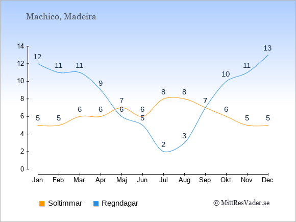 Grafen visar det genomsnittliga antalet soltimmar i Machico under en viss månad (soltimmar är det antalet timmar per dag där solen skinnar), och antalet regndagar (dvs. det genomsnittliga antalet dagar