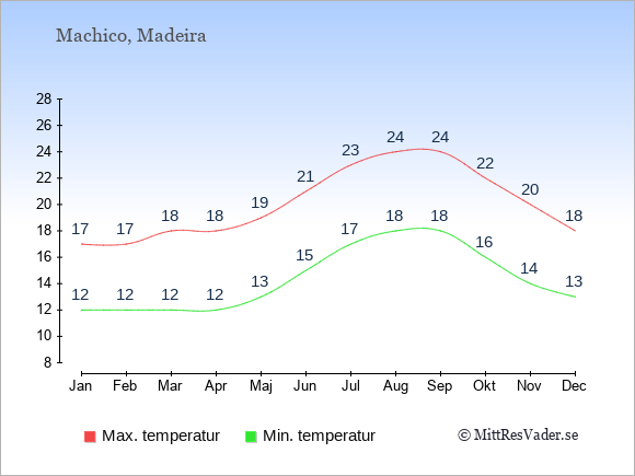 Grafen visar de genomsnittligt högsta temperaturerna i Machico (vanligtvis det värde som uppmätts mitt på dagen) och de genomsnittligt lägsta temperaturer (vanligtvis tidpunkten just innan soluppgång).