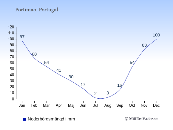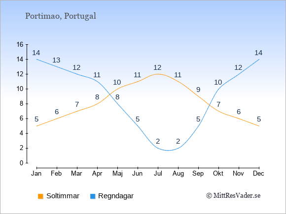 Väder i Portimao: Soltimmar och regndagar
