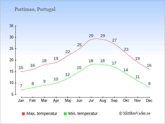 Grafen visar de genomsnittligt högsta temperaturerna i Portimao (vanligtvis det värde som uppmätts mitt på dagen) och de genomsnittligt lägsta temperaturer (vanligtvis tidpunkten just innan soluppgång).