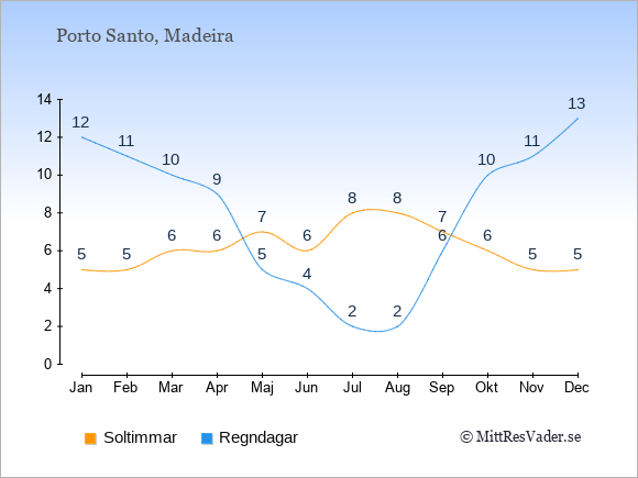 Grafen visar det genomsnittliga antalet soltimmar på Porto Santo under en viss månad (soltimmar är det antalet timmar per dag där solen skinnar), och antalet regndagar (dvs. det genomsnittliga antalet dagar