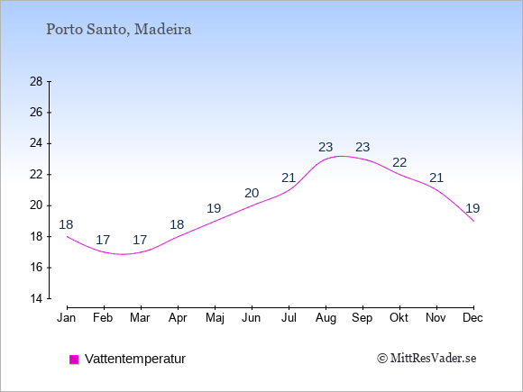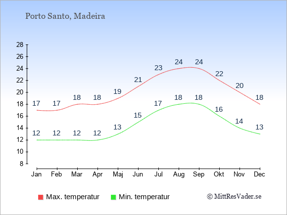 Grafen visar de genomsnittligt högsta temperaturerna på Porto Santo (vanligtvis det värde som uppmätts mitt på dagen) och de genomsnittligt lägsta temperaturer (vanligtvis tidpunkten just innan soluppgång).