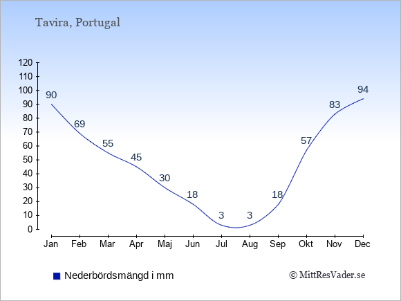 För att se hur vädret i Tavira skiljer sig från vädret hemma, kan du också jämföra siffrorna måned för måned med motsvarande siffror för Sverige under samma period här: Taviras klimat.