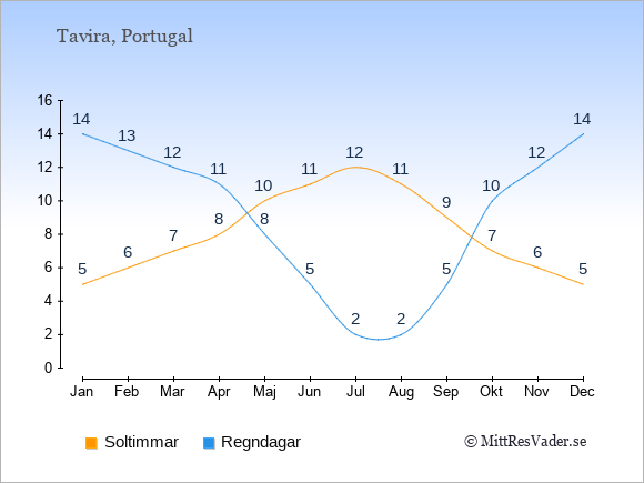 Grafen visar det genomsnittliga antalet soltimmar i Tavira under en viss månad (soltimmar är det antalet timmar per dag där solen skinnar), och antalet regndagar (dvs. det genomsnittliga antalet dagar