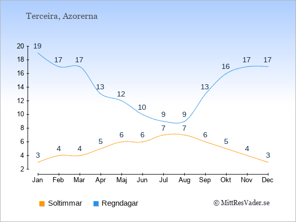 Grafen visar det genomsnittliga antalet soltimmar på Terceira under en viss månad (soltimmar är det antalet timmar per dag där solen skinnar), och antalet regndagar (dvs. det genomsnittliga antalet dagar