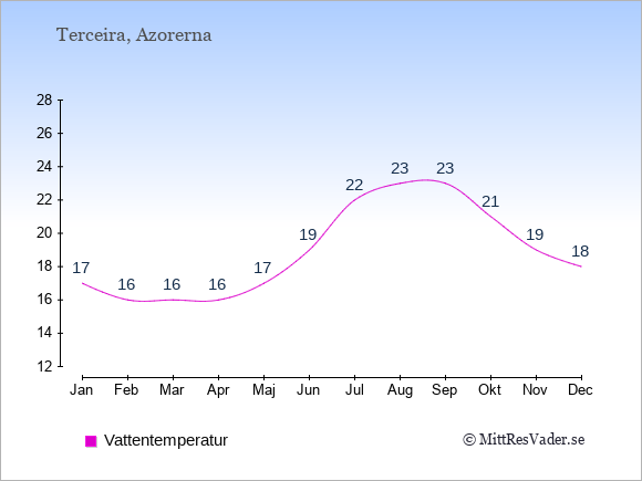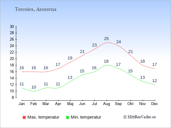 Grafen visar de genomsnittligt högsta temperaturerna på Terceira (vanligtvis det värde som uppmätts mitt på dagen) och de genomsnittligt lägsta temperaturer (vanligtvis tidpunkten just innan soluppgång).