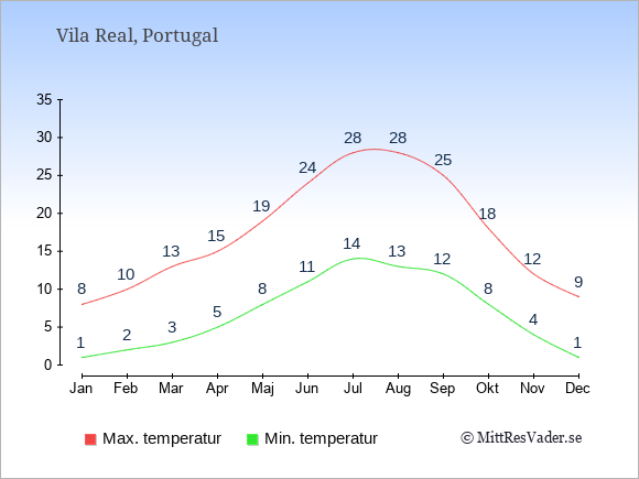 För att se hur vädret i Vila Real skiljer sig från vädret hemma, kan du också jämföra siffrorna måned för måned med motsvarande siffror för Sverige under samma period här: Vila Reals klimat.