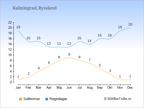 Grafen visar det genomsnittliga antalet soltimmar i Kaliningrad under en viss månad (soltimmar är det antalet timmar per dag där solen skinnar), och antalet regndagar (dvs. det genomsnittliga antalet dagar