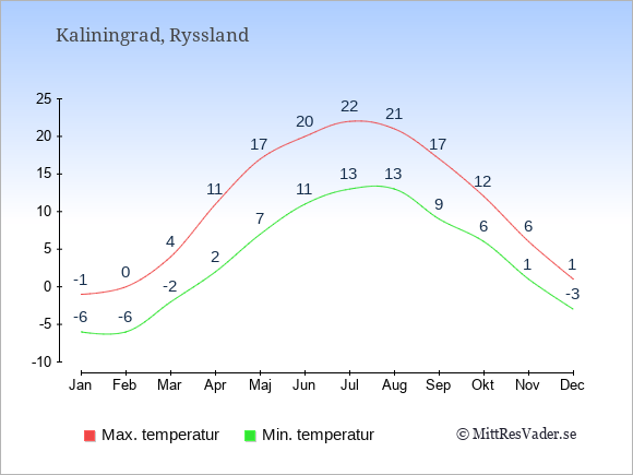 Grafen visar de genomsnittligt högsta temperaturerna i Kaliningrad (vanligtvis det värde som uppmätts mitt på dagen) och de genomsnittligt lägsta temperaturer (vanligtvis tidpunkten just innan soluppgång).
