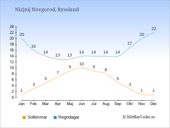 Väder i Nizjnij Novgorod: Soltimmar och regndagar