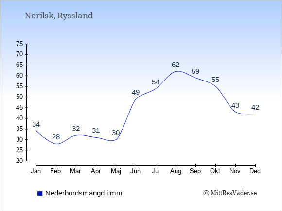 För att se hur vädret i Norilsk skiljer sig från vädret hemma, kan du också jämföra siffrorna måned för måned med motsvarande siffror för Sverige under samma period här: Norilsks klimat.