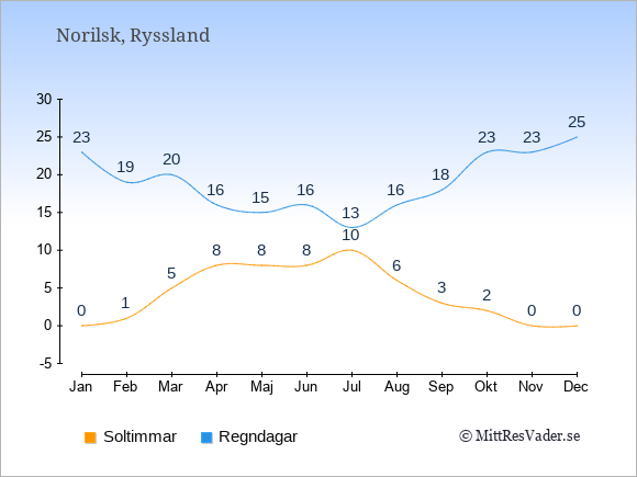 Grafen visar det genomsnittliga antalet soltimmar i Norilsk under en viss månad (soltimmar är det antalet timmar per dag där solen skinnar), och antalet regndagar (dvs. det genomsnittliga antalet dagar
