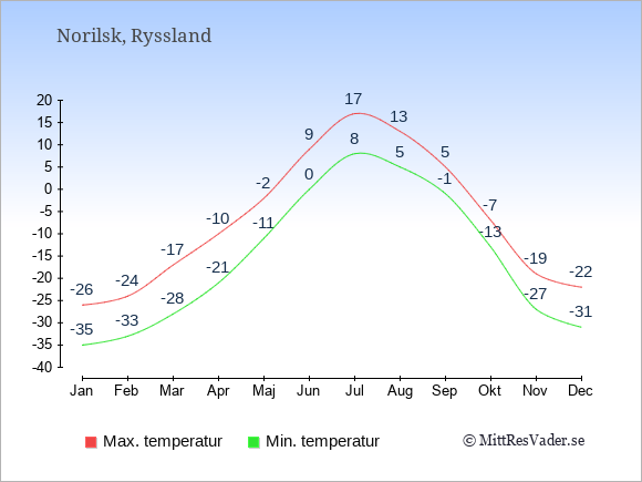 Grafen visar de genomsnittligt högsta temperaturerna i Norilsk (vanligtvis det värde som uppmätts mitt på dagen) och de genomsnittligt lägsta temperaturer (vanligtvis tidpunkten just innan soluppgång).