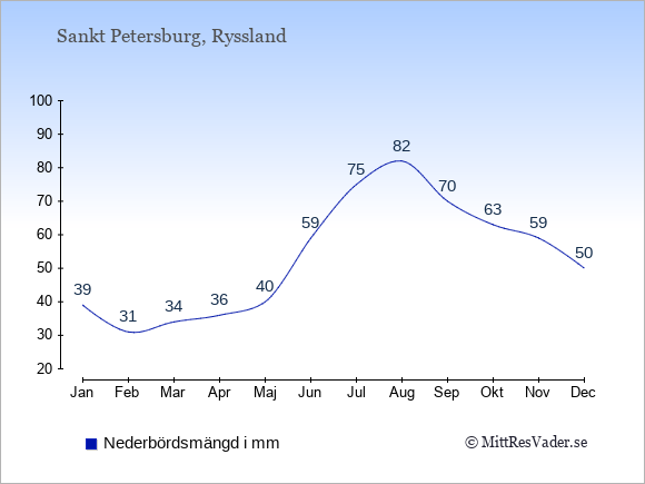 För att se hur vädret i Sankt Petersburg skiljer sig från vädret hemma, kan du också jämföra siffrorna måned för måned med motsvarande siffror för Sverige under samma period här: Sankt Petersburgs klimat.