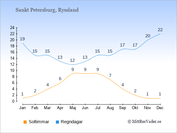 Grafen visar det genomsnittliga antalet soltimmar i Sankt Petersburg under en viss månad (soltimmar är det antalet timmar per dag där solen skinnar), och antalet regndagar (dvs. det genomsnittliga antalet dagar