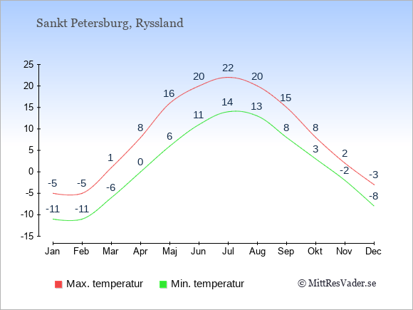 Grafen visar de genomsnittligt högsta temperaturerna i Sankt Petersburg (vanligtvis det värde som uppmätts mitt på dagen) och de genomsnittligt lägsta temperaturer (vanligtvis tidpunkten just innan soluppgång).